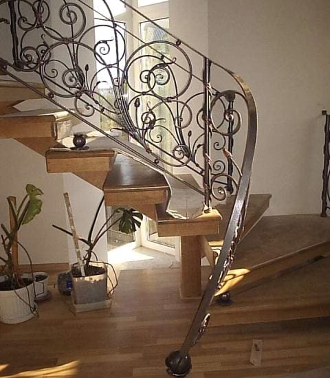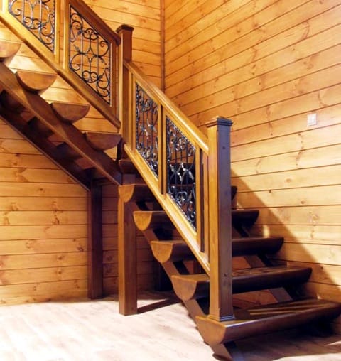 Или металлическими кованными вставками. Кованые элементы очень хорошо сочетаются с массивной деревянной лестницей.