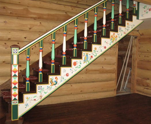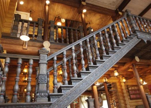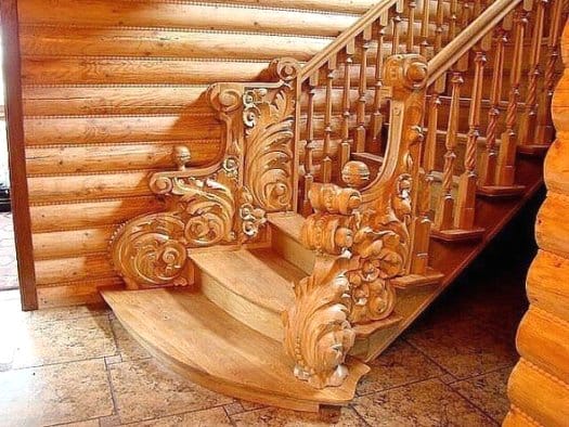 В доме в стиле «русская изба» деревянная резная лестница является продолжением экотемы дизайна интерьера. Резчики по дереву создавали и создают поныне настоящие шедевры русского зодчества. Элементы лестниц украшались причудливыми узорами с различной тематикой.
