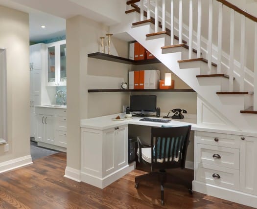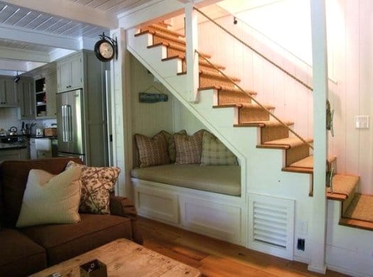 Иногда обустройство пространства под лестницей является не только экономией полезной площади, но и интересной дизайнерской находкой. Под лестницей можно расположить удобное место отдыха. Такие уютные уголки очень любят дети.
