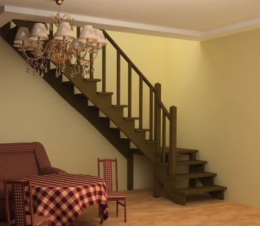 Лестница с забежными ступенями так же занимает мало места, ввиду того, что отсутствует межлестничная площадка. Неудобство состоит в том, что ступени к центру сужаются. Однако при ширине марша не менее 1000 мм по ней можно не только свободно подняться на второй этаж, но и внести туда мебель, что достаточно трудно сделать в случае устройства винтовой конструкции.