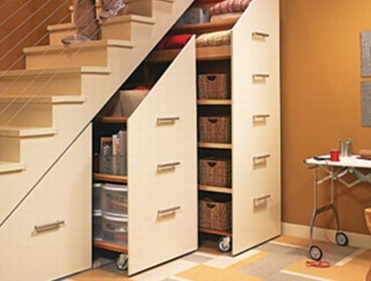 Выдвижные шуфляды на колесиках помогут использовать подлестничное пространство на сто процентов. Вам будет доступен каждый сантиметр для хранения необходимых вещей и уборки данной территории.