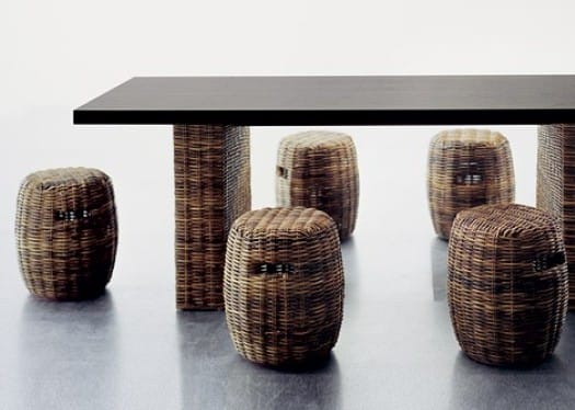 Комплект мебели из ротанга непременно украсит столовую или обеденную зону. Обычные стулья заменены оригинальными плетеными табуретами в форме бочонков. Столешница выполнена из массива дерева. Данный комплект подойдет для интерьера в стиле минимализм.