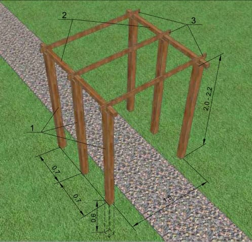 Для изготовления простой деревянной перголы нам понадобятся 4-6 деревянных столбов (1) сечением 75х75 или 100х100 мм и высотой 2 — 2,2 м, которые будут установлены вертикально в качестве опор. К опорам крепим поперечные боковые балки (2), к которым в свою очередь крепятся перекладины. В качестве перекладин можно использовать обрезную доску сечением 20х200 мм.