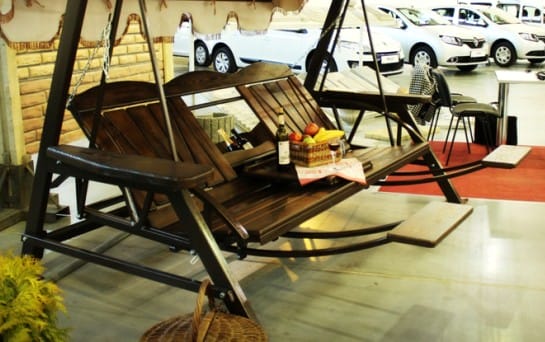 Отдыхать, так отдыхать! Так решили конструкторы, разработавшие следующий вариант. Как мы видим, здесь прямо на скамейке удобно разместился небольшой столик для напитков и десертов. Для ног придуманы отдельные опорные площадки, позволяющие уставшим мужчинам растянуться во всю «богатырскую ширь».