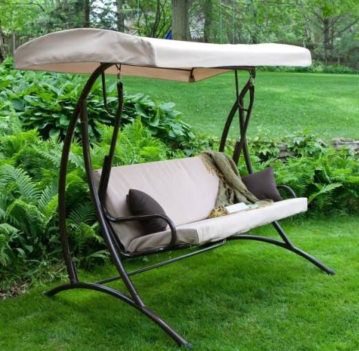 Еще одно интересное решение – садовые качели в виде гамака. У них нет спинки. Она просто не нужна тем, что хочет в полный рост растянуться на мягком ложе и покачаться на нем, убаюкивая себя.