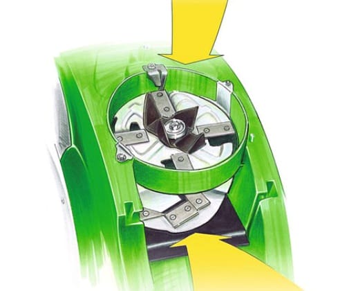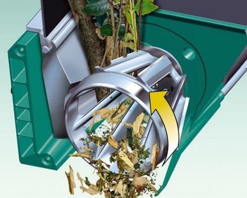 Фрезерные измельчители оснащаются цельнолитым шестеренчатым ножом, который надежнее и долговечнее дискового. Такие устройства часто оснащаются механизмом втягивания веток. Он избавляет владельца от необходимости стоять рядом и продвигать руками ветки в воронку.