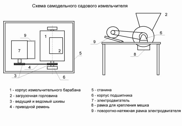 Проанализировав схему агрегата, нетрудно заметить, что ничего особо сложного в его конструкции нет. Рама, корпус, вал с ножами, загрузочная воронка, рамка для крепления сборочного мешка, бензиновый или электрический мотор.