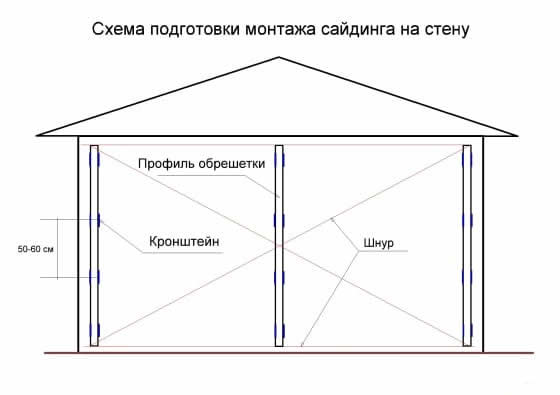 Выровняв и закрепив угловые стойки обрешетки, по натянутому шнуру выставляют промежуточные. После этого к ним крепятся горизонтальные металлические профили (или деревянные бруски), повышающие пространственную жесткость системы. На оконных и дверных коробках закрепляют специальный обрамляющий профиль, прикрывающий боковые торцы, нижние и верхние полки сайдинга.
