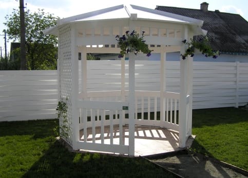Купить и установить беседку из пластика не составит труда. В среднем она обойдется вам от 10000 руб. в зависимости от габаритов. Сама конструкция бывает разной формы в плане (круглой, квадратной, прямоугольной, многоугольной). Такая беседка хорошо впишется в ландшафтный дизайн участка. Ее, как и любую другую, можно украсить плетущимися декоративными растениями (роза, клематис, плющ).