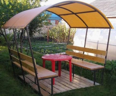 В комплекте помимо каркаса и навеса или тента могут поставляться следующие элементы: столик, стулья, скамья, барбекю и т.д.
