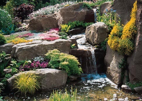 сложная большая композиция из крупных камней, водопада, растений альпийской флоры, подсветки (площадь от 10 кв. м.) обойдется дороже всего – около 25 тыс. руб. за 1 кв. м.