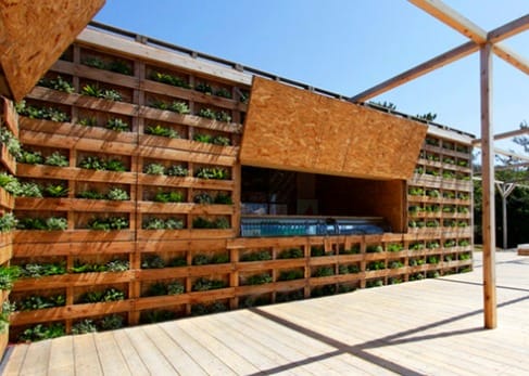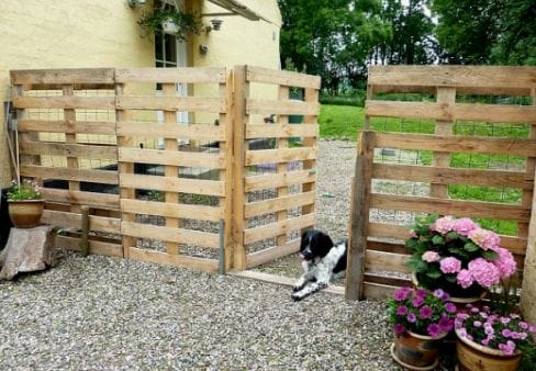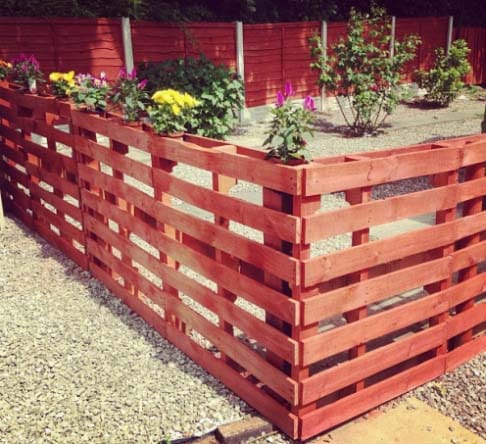 Продолжая тему ограждения, из поддонов можно сделать декоративные ширмы и вертикальные зеленые стенки, которыми можно замаскировать старые строения или разделить большой участок на зоны.