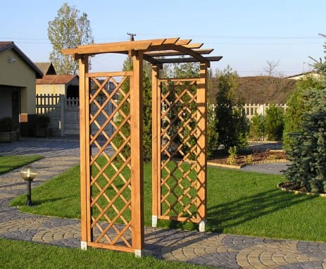 Перед сооружением перголы из дерева все детали проходят тщательное просушивание. Для строительства этих конструкций используется сосна, дуб или ель. Деревянную перголу монтируют следующим образом – в землю, в качестве опор, вкапывают два столба (металлических, деревянных или бетонных), между которыми закрепляются арки или перекладины и поперечные брусья.