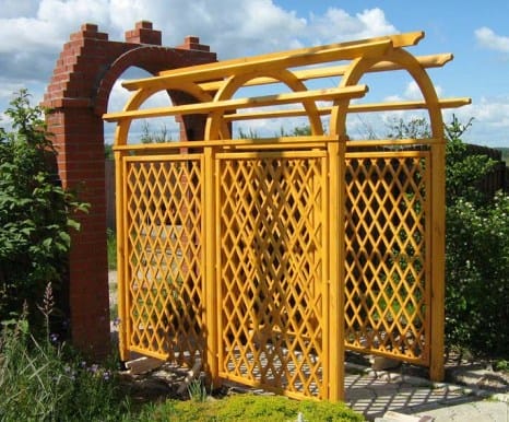 Она состоит из определенного количества легких арок, которые соединяются между собой при помощи поперечных металлических или деревянных креплений. Данная конструкция дает возможность защитить определенный участок от солнца или образовать некий переход от павильона к дому или, к примеру, беседке.