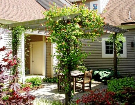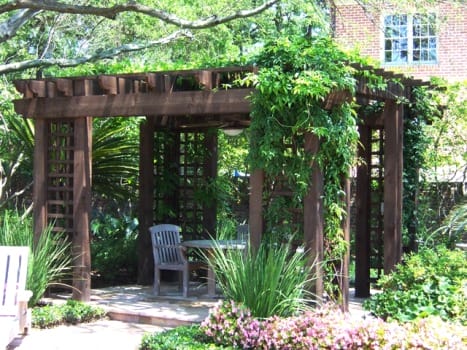 Перголу часто используют в качестве «опоры» для вьющегося винограда или розы. Зачастую ее украшают многолетние вьющиеся растения, к примеру, ипомея или душистый горошек. Также подойдут вьюны, плющи, жимолость или гортензии.