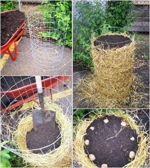 В такой конструкции можно выращивать не только цветы, ягоды и травы, но и картофель. Для последнего варианта сетку сворачиваем в цилиндр, закрепляем. Диаметр примерно 90-100 см. Внутренние стенки нужно обложит соломой, и получившуюся конструкцию заполнить компостом, причем не всю сразу, а постепенно.