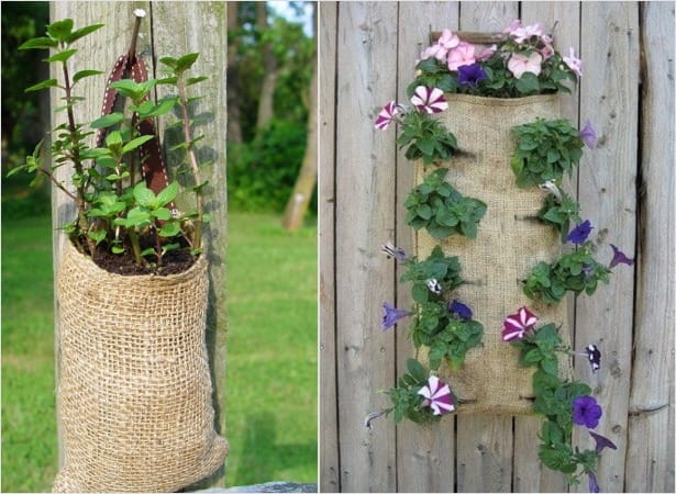 Шьем мешочек, который заполняем грунтом и подвешиваем на стену или забор. В мешке можно сделать небольшие горизонтальные разрезы, куда и высаживаем рассаду. Минус – частый полив, ведь мешковина очень хорошо пропускает воздух.