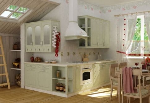 В столовой зоне и на кухне уместны будут кружевная скатерть или занавески, букеты из сухоцветов или свежих полевых цветов, кованые подсвечники или держатели для открытых полок, кованая люстра над столом, разнообразные предметы в стиле декупаж (часы, банки для сыпучих продуктов и пр.).