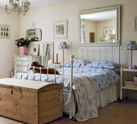 В качестве прикроватной тумбочки в спальне можно использовать окрашенную в белый цвет деревянную табуретку, поставив на нее светильник с цветастым абажуром. Льняное стеганое покрывало, кружевные подушки, зеркало в кованой раме – все это атрибуты прованской спальни.