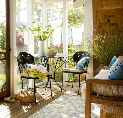 Закрытые веранды часто служат прихожей зоной. Тут можно предусмотреть систему хранения в виде открытых стеллажей из металла или дерева, прикрытых льняными шторками.