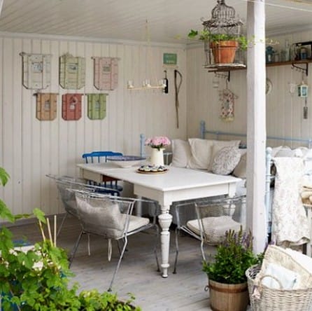 Поставьте на террасе плетеную мебель или мебель с элементами ковки с яркими или неброскими подушками для удобства, а по периметру разместите разнообразные растения в горшках. На стенах закрепите кашпо с ярко цветущими цветами.