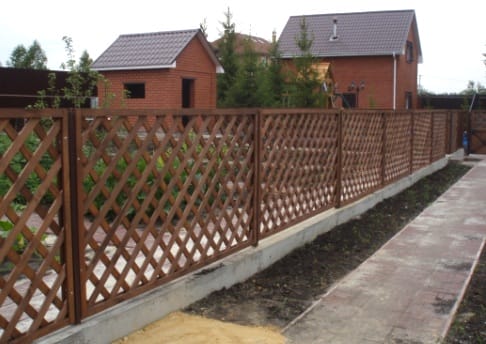 Решётка. Наполнение такого забора состоит из перекрещённых между собой (прямо либо по диагонали), реек или досок. Его воздушность и ажурность, позволяет использовать этот вид забора для зонирования приусадебного участка.
