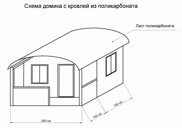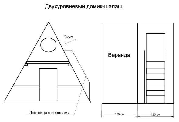 План-схема домика должна предусматривать не только игровую комнату, но и небольшую открытую веранду, на которой дети смогут играть. Размер строения в плане желательно сделать не менее 2,5х1,5 метра.