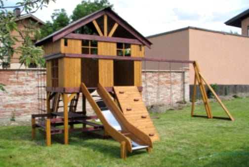 Подняться туда можно не только по обычной лестнице, но и по специальному наклонному настилу, тренирующему ловкость и развивающему координацию движений. Боковая опора с горизонтальной балкой, на которой подвешены качели — хорошее дополнение к дачному развлекательному комплексу.