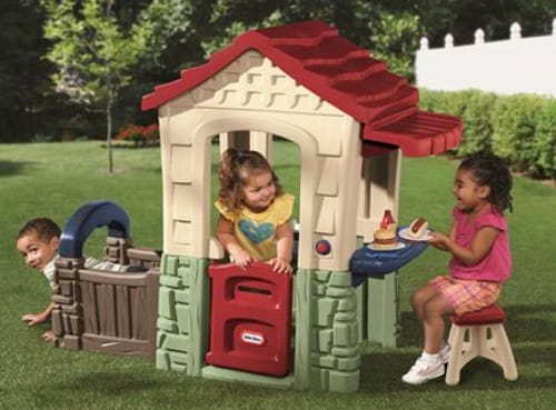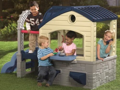Фантазия ребенка безгранична и разработчики стараются это учесть, оснащая детские домики дверными электрозвонками и светильниками, оборудуют верандами, игрушечной мебелью и кухонной техникой. Очень часто такой домик комбинируют с горкой и лесенкой. Так получается полноценная детская площадка на даче.