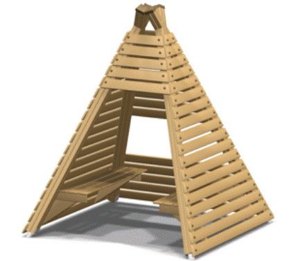 Можно построить деревянный домик в виде двухуровневого шалаша. Для этого на деревянной раме монтируется наклонный каркас из брусков сечением 50х80 мм, который затем обшивается плитой ОСП.