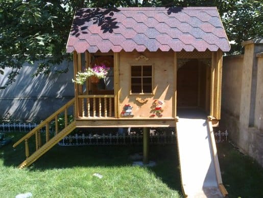 Место для игр не должно быть похоже на собачью будку, поэтому используйте для кровли светопрозрачный сотовый поликарбонат и сделайте в стенах не менее двух окошек, украсив их резной рамкой. Раскрашивать такое строение лучше всего, используя яркие сочные краски, а также трафареты с рисунками мультипликационных героев.