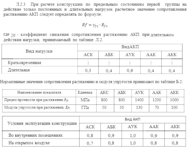 В пункте Л.2.3. находится понижающий коэффициент для всех видов пластиковой арматуры. Для стеклопластика, испытывающего постоянную нагрузку, он равен 0,3. Это значит, что его прочность в реальных условиях работы будет равна 800 х 0,3=240 МПа.