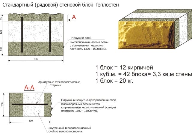 - внешний изготавливается из керамзитобетона с фактурной поверхностью, имитирующей природный камень или кирпич;