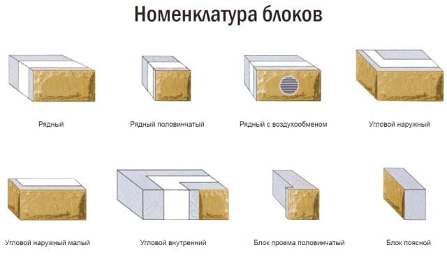 Поскольку блок теплостен представляет собой единую трехслойную конструкцию, то при кладке его нельзя резать на части. Учитывая это требование, производители выпускают широкую номенклатуру ТЭБ. В нее входят не только рядные блоки разной толщины, но также внутренние и наружные, поясные и вентиляционные, половинчатые и проемные.