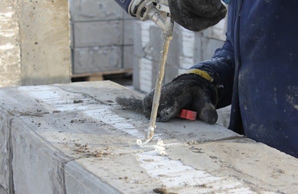 Вертикальные швы при кладке теплоблоков, заделывают особым образом. В зоне утеплителя их герметизируют строительной пеной. Наружный и внутренний швы в районе керамзита заделывают раствором с помощью строительного пистолета.