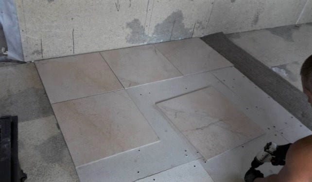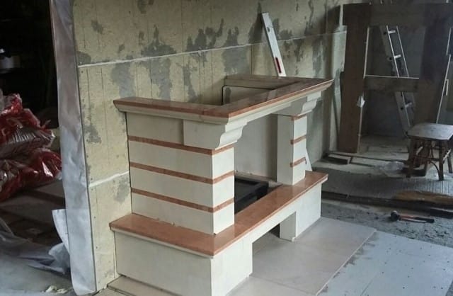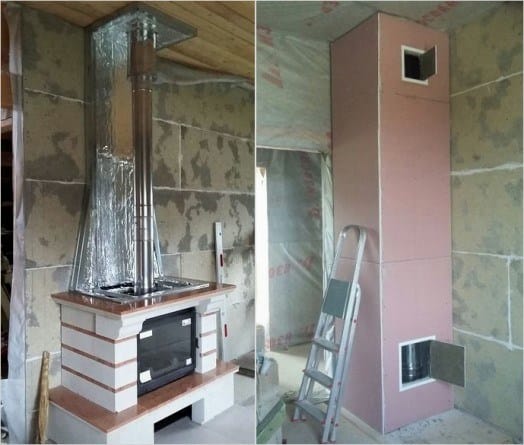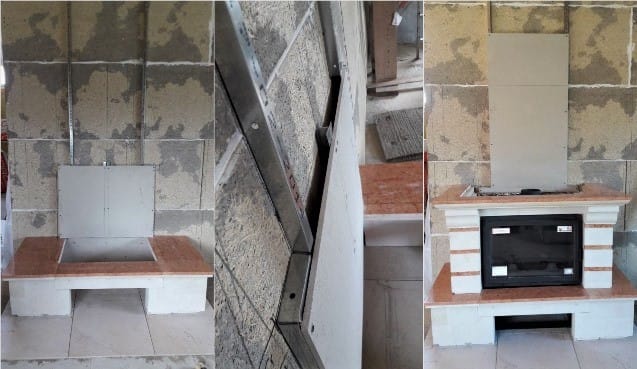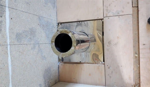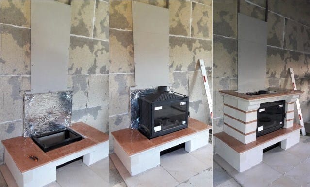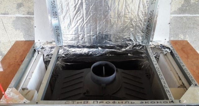 Под порталом была настелена плитка, по нормам пожарной безопасности образующая впереди площадку. Работы по установке велись уже на ней. Между стеной, обшитой гринбордом, и дымоходом, был дополнительно проложен утеплитель и лист минерита.