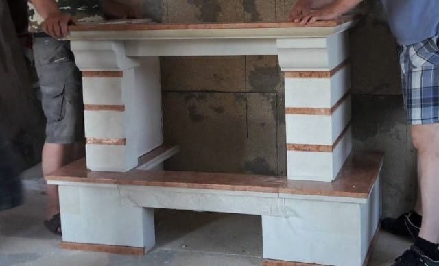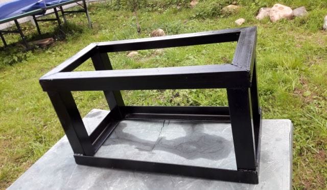 Вторым нюансом стало отсутствие подставки для установки топки вровень с отверстием портала. Скорее всего ее просто забыли положить во время погрузки с выставки, но так как прошло уже много времени, искать ее было уже поздно. Наш мастер не растерялся, и из металлических профилей за пару часов соорудил подставку методом сварки и покрасил ее специальной краской в черный цвет.