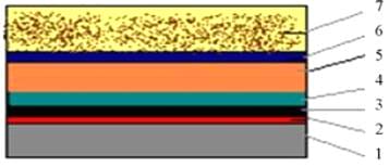 1 – несущая поверхность; 2 – клеющая мастика; 3 – разделительный или выравнивающий слой; 4 – пароизоляционный слой; 5 – теплоизоляционный слой; 6 – гидроизоляционный слой; 7 – защитный слой