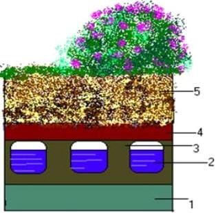 1– стандартная конструкция крыши; 2 – камеры для накопления воды; 3 – водо-накопительная плита; 4 – фильтрующий мат; 5 – субстрат