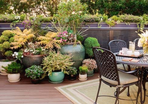 Смело используйте вьющиеся растений, которые красиво оплетут ограждение террасы. При выборе кустарников и деревьев также ориентируйтесь на низкорослые формы, карликовые. Это всевозможные низкорослые туи, можжевельники, спиреи, хеномелес и другие. Можно использовать как вариант растения в кадках. Это также позволит с легкостью поменять облик террасы, всего лишь переставив их.