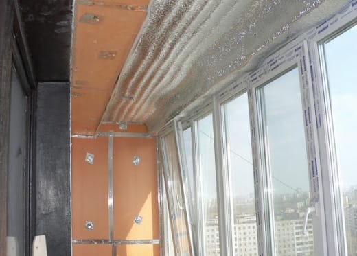 Аналогично выполняются работы по утеплению балконов и лоджий. Стыки между плитами проклеиваются скотчем. После устройства пароизоляции фольгированной ПЭ пленкой, стыки также проклеиваем скотчем – создаем своеобразный термос.