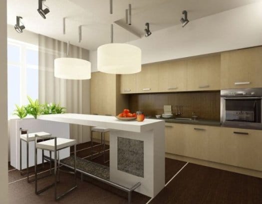 Например, поворотную, выдвижную, передвижную, откидную или подвесную стойку, когда столешницу, подвешенную к потолку, опускают при помощи специальных механизмов. Если у вас маленькая кухня, то имеется возможность сэкономить пространство, а если большая – создаются две различные функциональные зоны.
