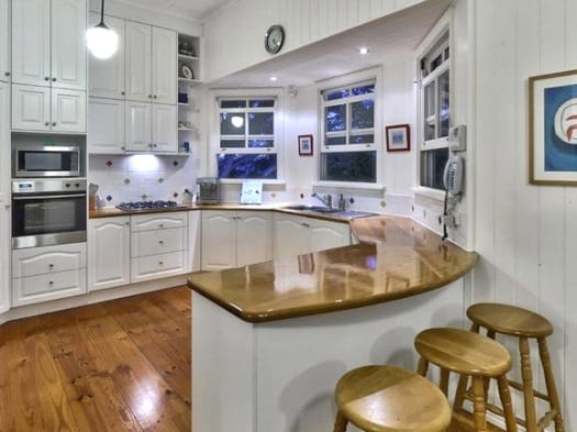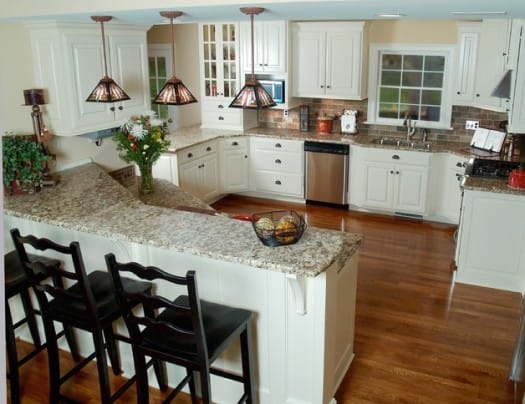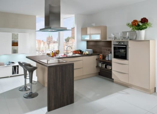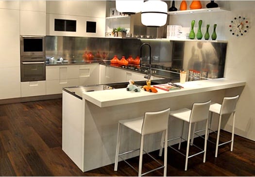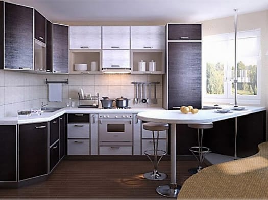 Очень интересен ещё один вид – угловая кухня с придатком барной стойки. Смысл заключается в том, что стойка к примыкает к столешнице и закрепляется без помощи функционального дерева и вертикальных опор.
