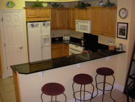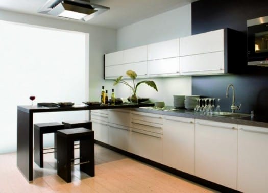 Возможен также вариант: применить барную стойку в качестве столешницы-придатка, которую располагают перпендикулярно основной части кухонной мебели. Что позволяет оформить кухню буквой П или Г и не загромождать её обеденным большим столом.