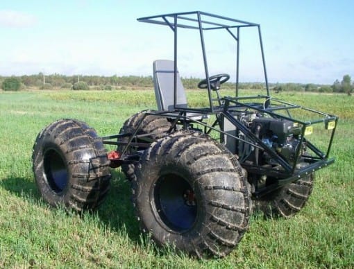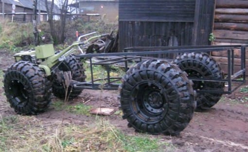 Тот, кто своими руками сделал минитрактор, вездеход из мотоблока соберет без проблем. Для этого достаточно поменять стандартные диски на более широкие и установить на них внедрожную резину.
