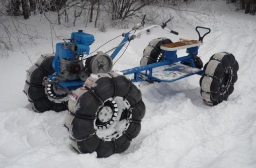 Владельцы тяжелых мотоблоков с прицепной тележкой могут сделать из него самодельный снегоход, вообще не меняя конструкцию. Для этого достаточно переобуть свой ручной трактор в новые внедорожные «лапти». Покрышки перед этим нужно спустить, затем поддомкратить раму, вставить колеса в грунтозацепы и снова накачать их. После этой несложной работы можно спокойно отправляться в путешествие по заболоченной местности или по глубокому рыхлому снегу.