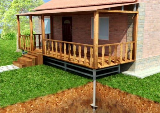 На легких песчаных и песчано-глинистых грунтах можно использовать винтовые сваи или асбоцементные трубы диаметром 150 мм, залитые бетоном. Они послужат прочным основанием для монтажа несущей рамы. Сваи и трубы нужно заглубить в грунт ниже отметки его сезонного промерзания (1,2-1,4 м), чтобы их не вытолкнуло наружу в морозный период.