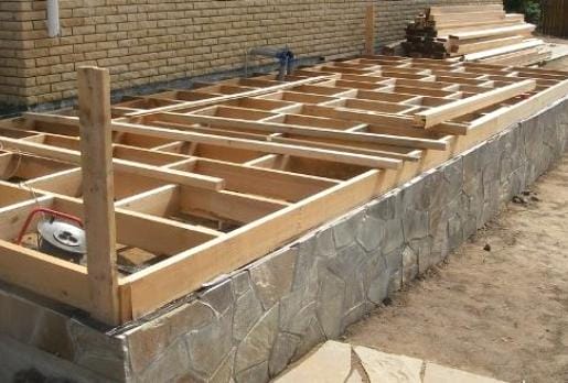 Цементный раствор для такого фундамента нам потребуется только выше поверхности грунта. Он нужен для заливки бутового ростверка, на котором укладывается два слоя рубероидной гидроизоляции. На ней возводят стены веранды или же монтируют деревянную несущую раму под каркас.
