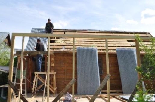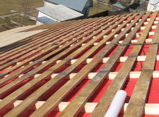 После укладки стропил крыши, по такой же схеме утепляется потолок веранды. Затем можно приступать к набивке обрешетки (сплошной под битумную черепицу и разреженной под шифер или стальной профилированный лист).