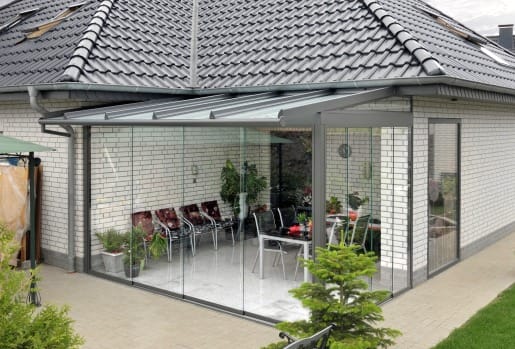 Раздвижные остекленные двери – непременный атрибут такой веранды.